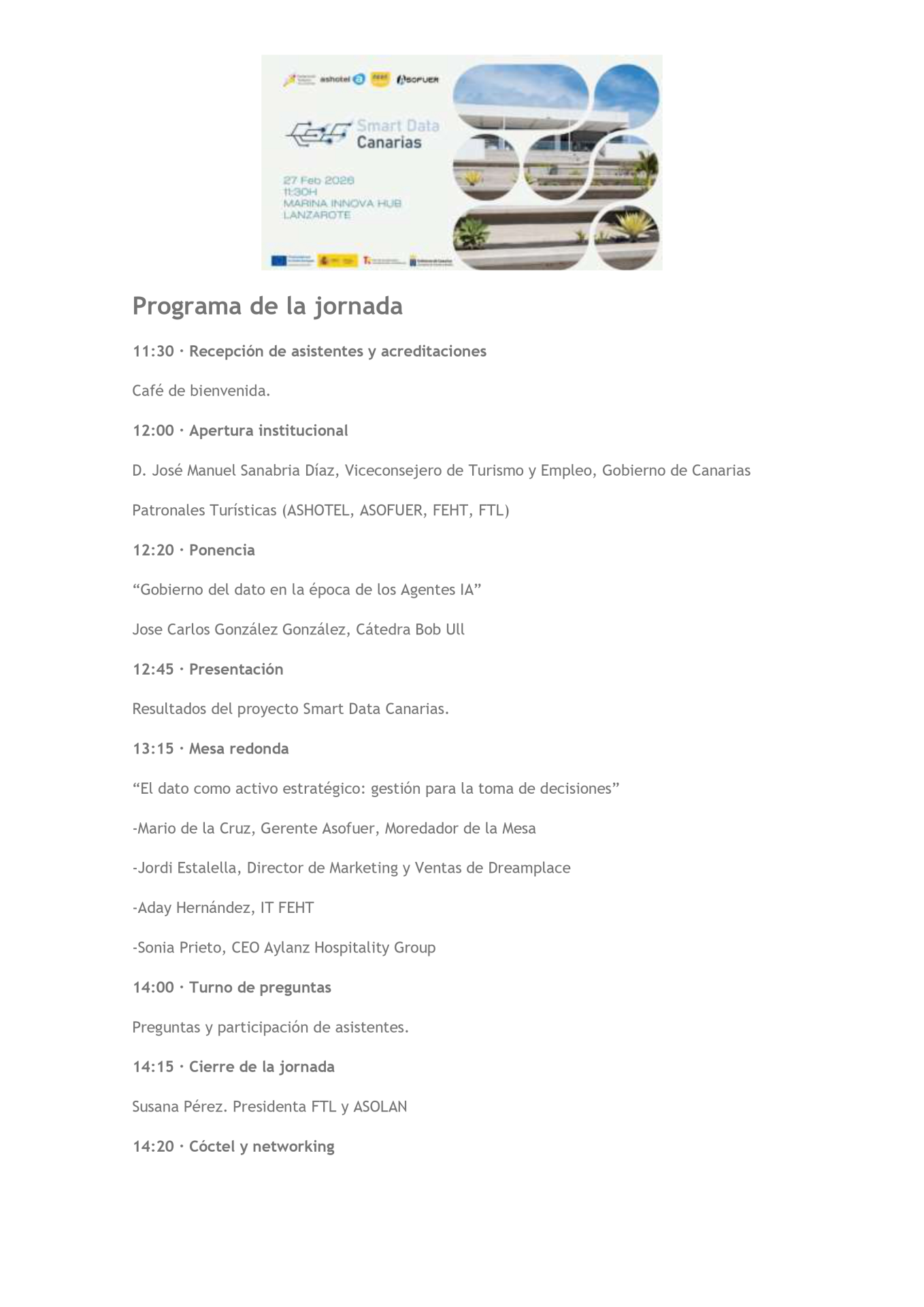 Las patronales turísticas de Canarias, Asofuer, Ashotel, FEHT y FTL presentarán e ste viernes, 27 de febrero, a las 12 horas,en Marina Innova Hub de Lanzarote, algunos de los resultados del desarrollo del proyecto`Smart Data Canarias",una herramienta tecnológica innovadora que permite analizar en tiempo real los indicadores de sostenibilidad y competitividad del sector alojativo canario y convertir el Archipiélago en referente en cuanto al uso de datos en la toma de decisiones.